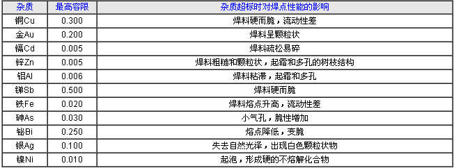 焊料中除锡.铅外往往含有少量他元素,如铜.锑.铋等。另外,在焊接作业中PCB和元件脚上的杂质也会带入锡炉内,这些元素对焊锡的性能会有影响,下表列出的为中国电子行业标准SJ/T10134-94中杂质允许范围及对焊点性能的影响。